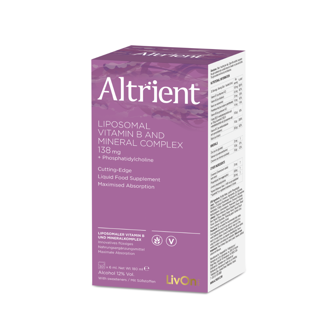 Altrient B is a Liposomal Vitamin B and Mineral complex including B1, B2, B6, B12, Niacin, Pantothenic Acid, Folate (Quatrefolic®) Biotin,