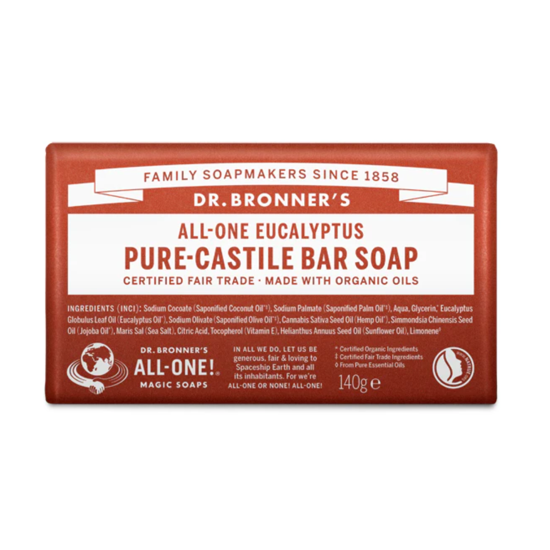 Earthy and warm, with a powerful menthol burst to open breathways and focus the mind! Scented purely with organic eucalyptus oil, our Eucalyptus Pure-Castile Bar Soap is made with certified fair trade ingredients and organic hemp oil for a soft, smooth lather that won't dry your skin. 100% biodegradable in a 100% post-consumer recycled wrapper.