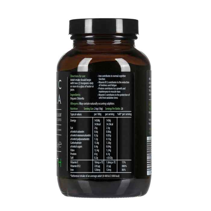 100% Organic Broken Cell Wall Chlorella, contains no fillers, preservatives, sweeteners or colours.