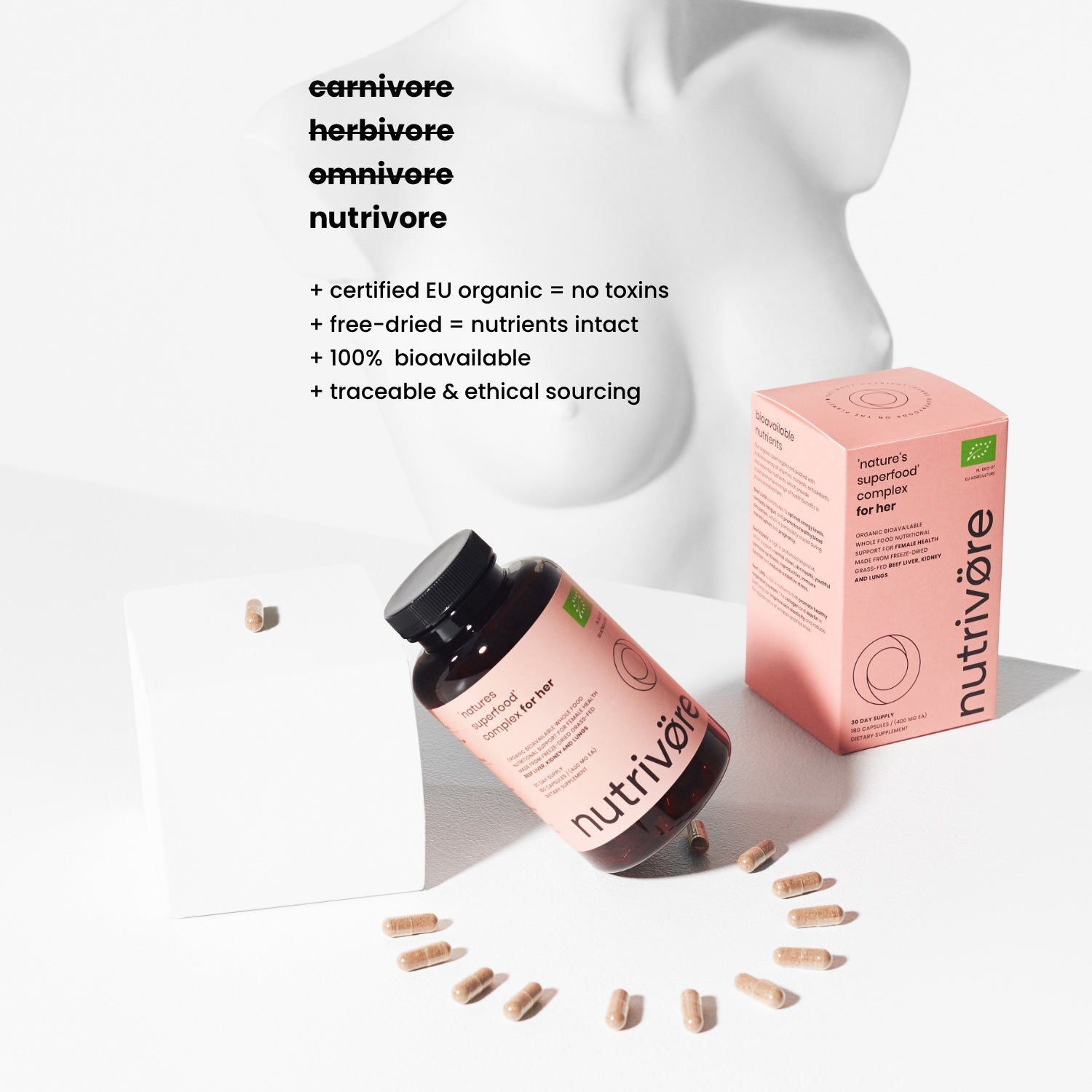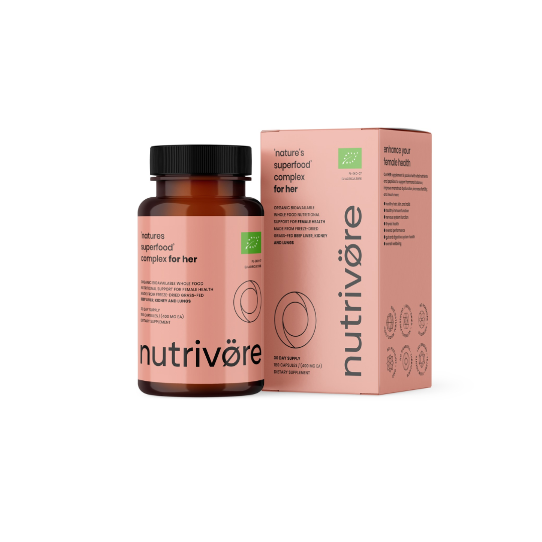 For HER is an organic food supplement made from freeze-dried grass-fed beef liver, kidney, and lungs.