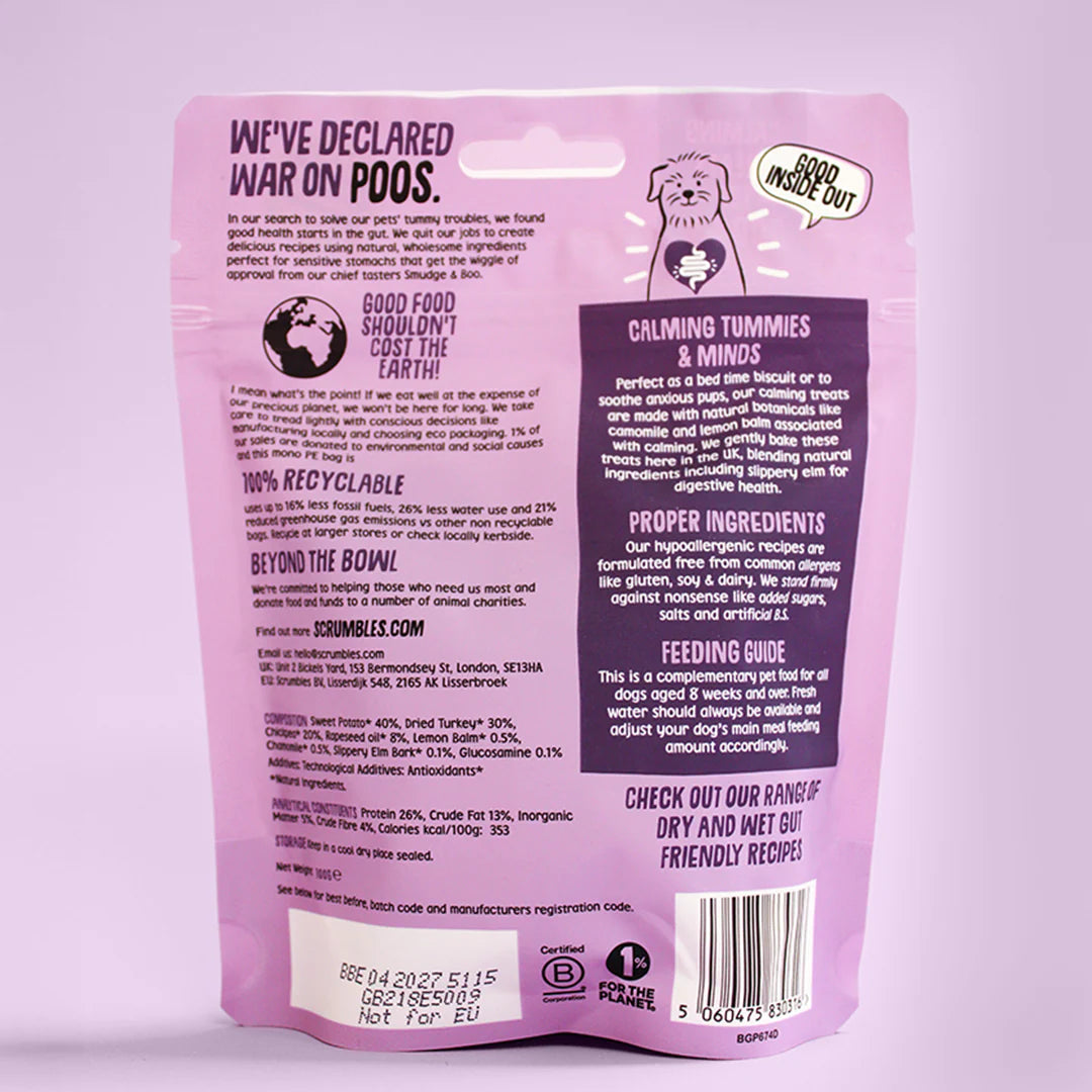 Does your dog get nervous or stressed during loud noises like fireworks, long car journeys, or when left alone due to separation anxiety? Our Scrumbles Calming Dog Treats are specially crafted to support your dog's emotional wellbeing naturally. Made with soothing ingredients like natural chamomile and lemon balm, these treats help ease anxiety and promote relaxation. Plus, they contain delicious turkey, a natural source of L-tryptophan, which can help your dog feel calm and improve sleep quality.